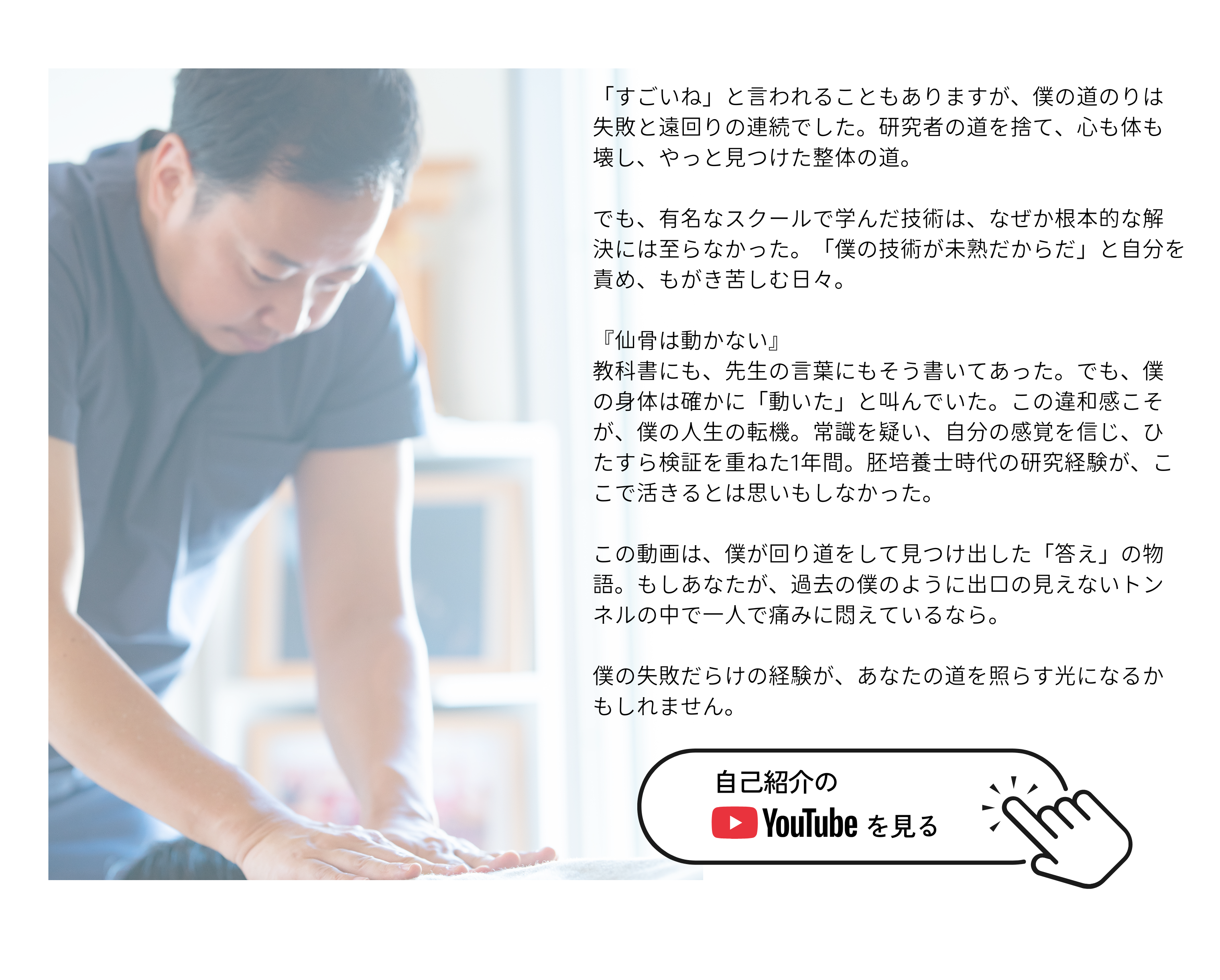 長い時間と大金をかけて学んだ施術で結果が出ず、苦しんだ時期がありました。仙骨にヒントを感じ、研究しオリジナルの仙骨調整を10,000症例にしてきたことで、いまでは症状の元になっている原因、解決すべき場所、症状の関連が判断できるようになりました。この理論と経験をもとに、症状の原因や解決方法をお伝えしていきます。一般的な考え方とかけ離れている内容も一部あるかもしれません。とはいえ、経験して確信している内容です。お役に立てると幸いです。 身体がつらい人は以下のプレゼントをLINEで受け取ってください。 1、ぎっ ...
